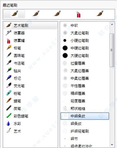 六、笔刷挑选器新的笔刷挑选器在一个位置融合了所有笔刷类别和笔刷类型,方便您找到寻找的笔刷。新的笔刷挑选器可用于绘画、效果和克隆工具,光标悬停在各个预设上时还提供笔尖和笔刷笔触的预览。它还存储您最近使用的 5 个笔刷,让您更加轻松地重新利用喜爱的组合。