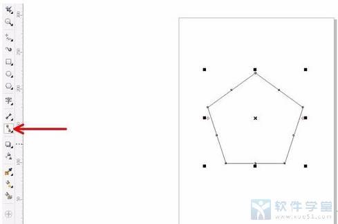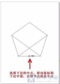 再选择形状工具,选择五边形下边的中点,方法是:移动鼠标到边的中部,出现节点二字,这里就是边的中点。