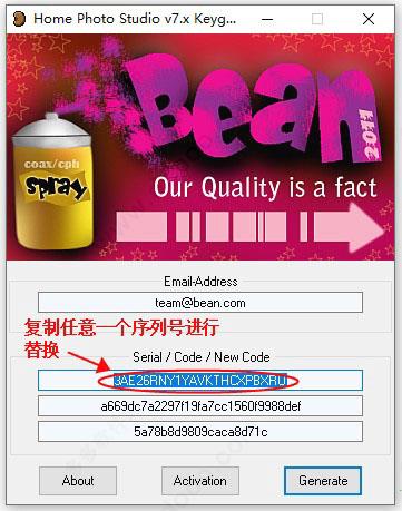 6、双击注keygen注册机,将注册机里的序列号替换成以下任意一个序列号,然后点击activation进行激活;