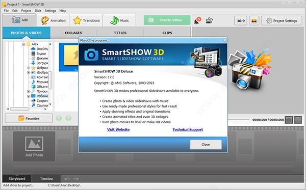 尽管是专业水平的幻灯片制作者,SmartSHOW 3D仍保持用户友好和直观的效果。即使您不是精通技术的人,设计器模板也可以在数分钟内为您提供帮助,而我们的视频课将帮助您在几天之内掌握该智能幻灯片软件的专业工具。