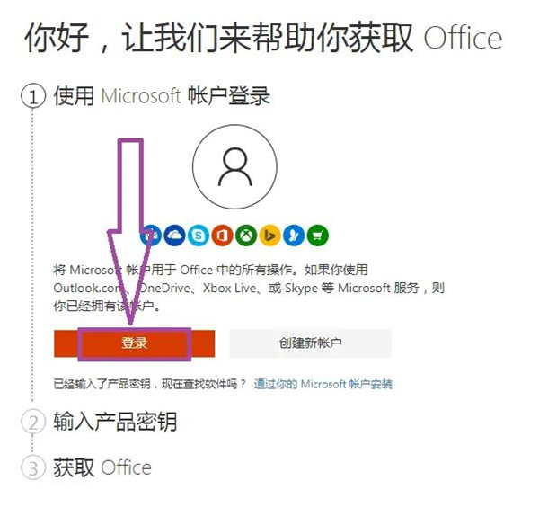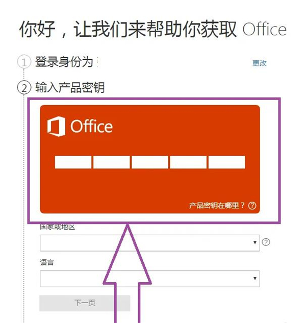 登录完成后,就会进入到产品密钥的输入页面,在页面上输入我们的产品密钥,即可激活并获取OFFICE365。