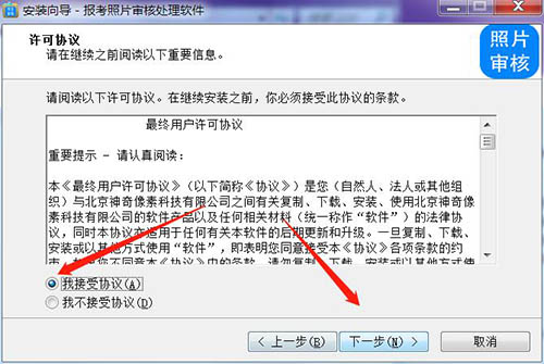2.在用户许可协议界面,选择“我接受协议”,然后点击“下一步”;