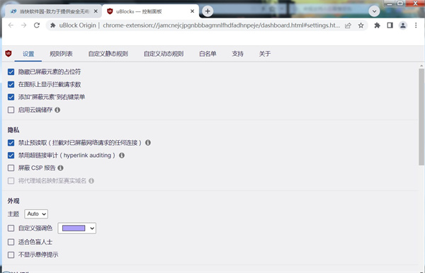 2.可以在选项列表的过滤器中加载和执行以下规则:easylist-Peter Lowe的广告服务器列表、EasyPrivacy-恶意软件领域等。