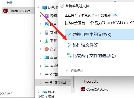 8.打开Crack文件夹,将里面的CorelCAD.exe复制替换到目标中的文件;