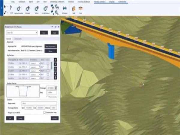 4、简化对复杂几何形状的配筋 借助新的肢表面功能,无论制作的形状有多复杂,都可以在混凝土面上自动创建钢筋设置。该流程利用自动创建的水平和垂直层,这些层可通过标准编辑命令进行编辑。 5、更快速的绘图和渲染 图纸的渲染速度更胜以往!现在,您可以享受类似于 CAD 的绘图速度和更高的平移与缩放性能。6、参考模型的新渲染选项 元素可见性增加了新函数,让区分参考模型、组件和零件比以往更加简明。 7、新 IFC4 输出可以将为钢筋构件创建的新制造和对象数据添加到 IFC4 导出。属性窗格现在提供子类型,为 IFC4 导出提供了进一步的分类可能性。我们添加了特定于桥的 IFC4 导出功能,可通过基于模型的数字工作流进行桥设计和施工。8、使用桥创建器制作更复杂的几何形状 桥创建器扩展改进了抛物线变动。现在,纵向抛物线变动可创建更复杂的几何形状。桥工程师可以创建抛物线,其中截面会根据抛物线方程沿整个长度变动。 9、沿桥的任何一条画线创建剖面 现在,您可以沿任何一条预定义的路径创建剖面图图纸。该功能可构建针对整个桥的整体可视化图纸,该图纸在工作中极为常用。可沿任何线(包括回旋曲线及蛇形折线)创建该剖面或标高。